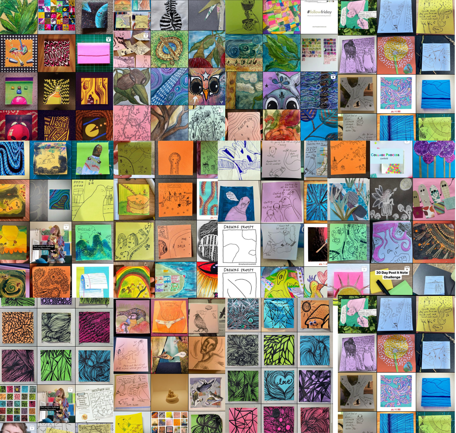 “I love this challenge as it’s a low barrier approach to doing something creative every day. My partner and I have been doing it together at the end of each night as a nice way to unwind, make art, and share what we’ve made with each other, and now our wall has a cute little post-it gallery!”